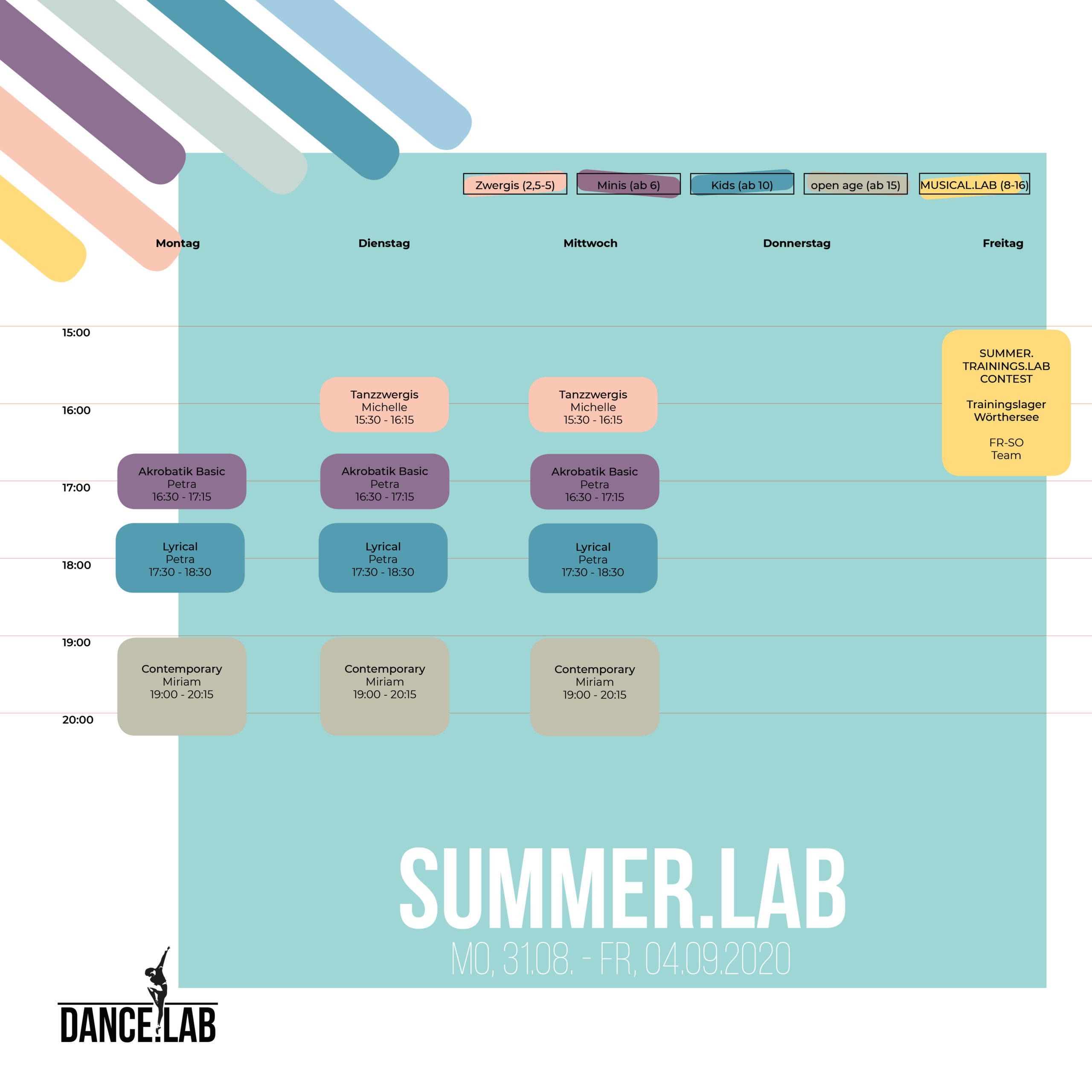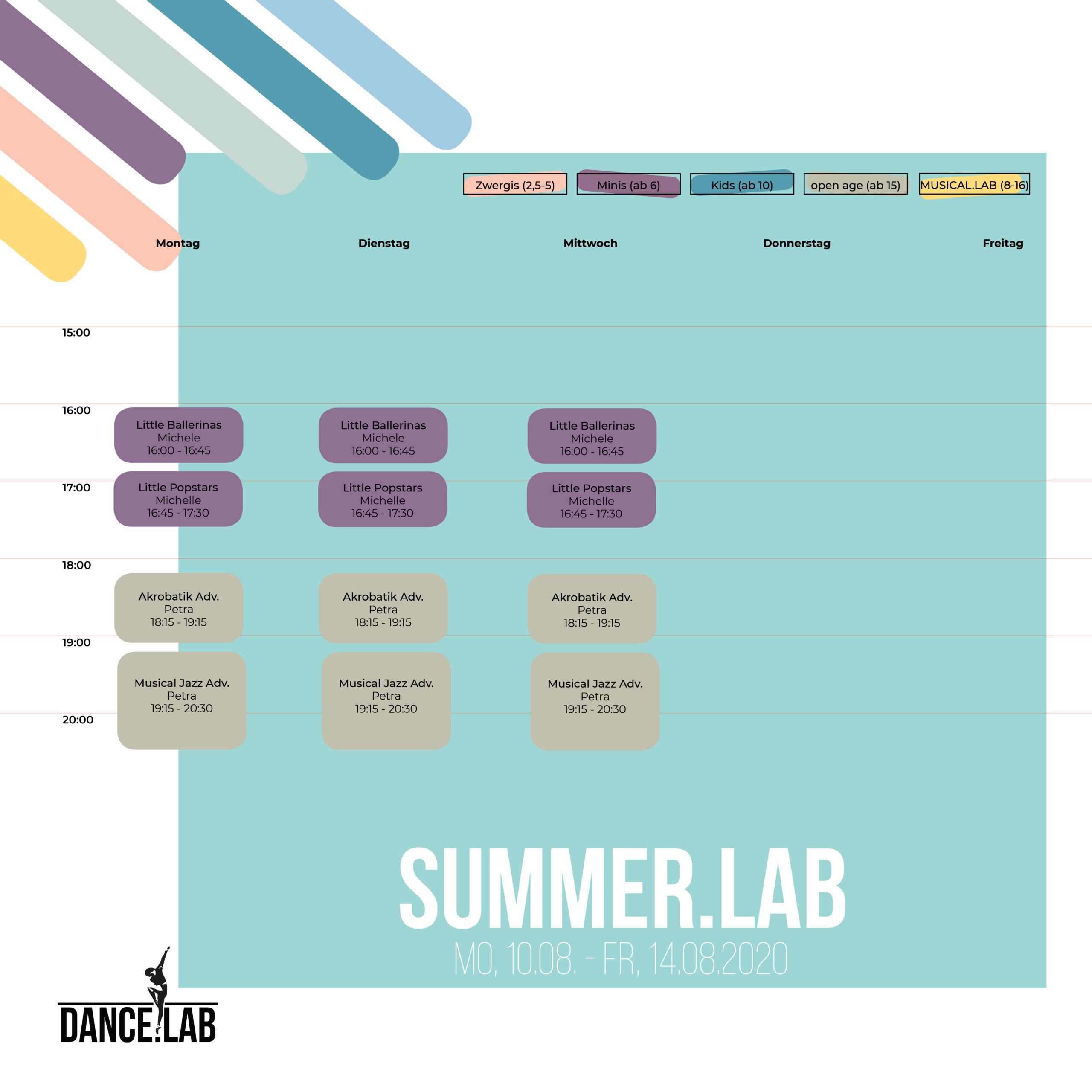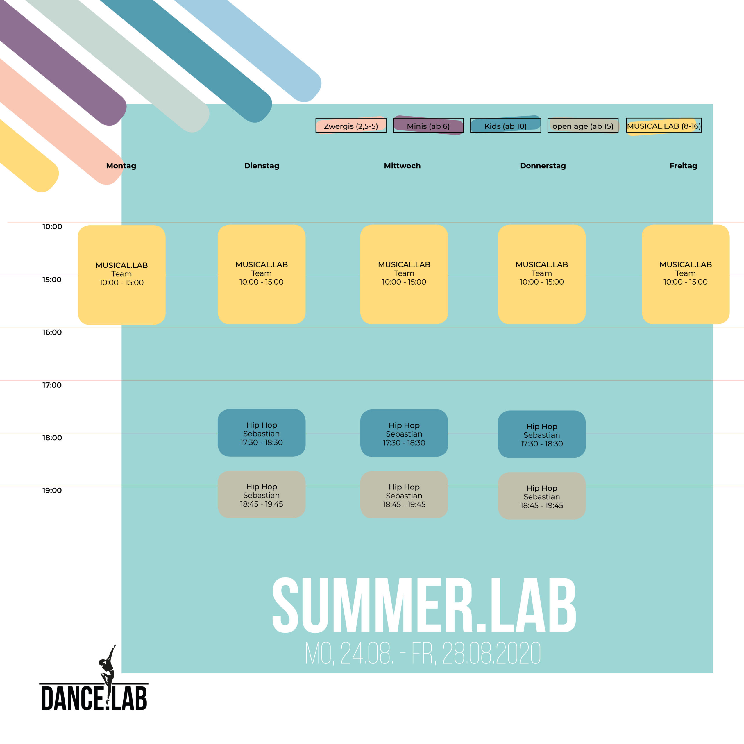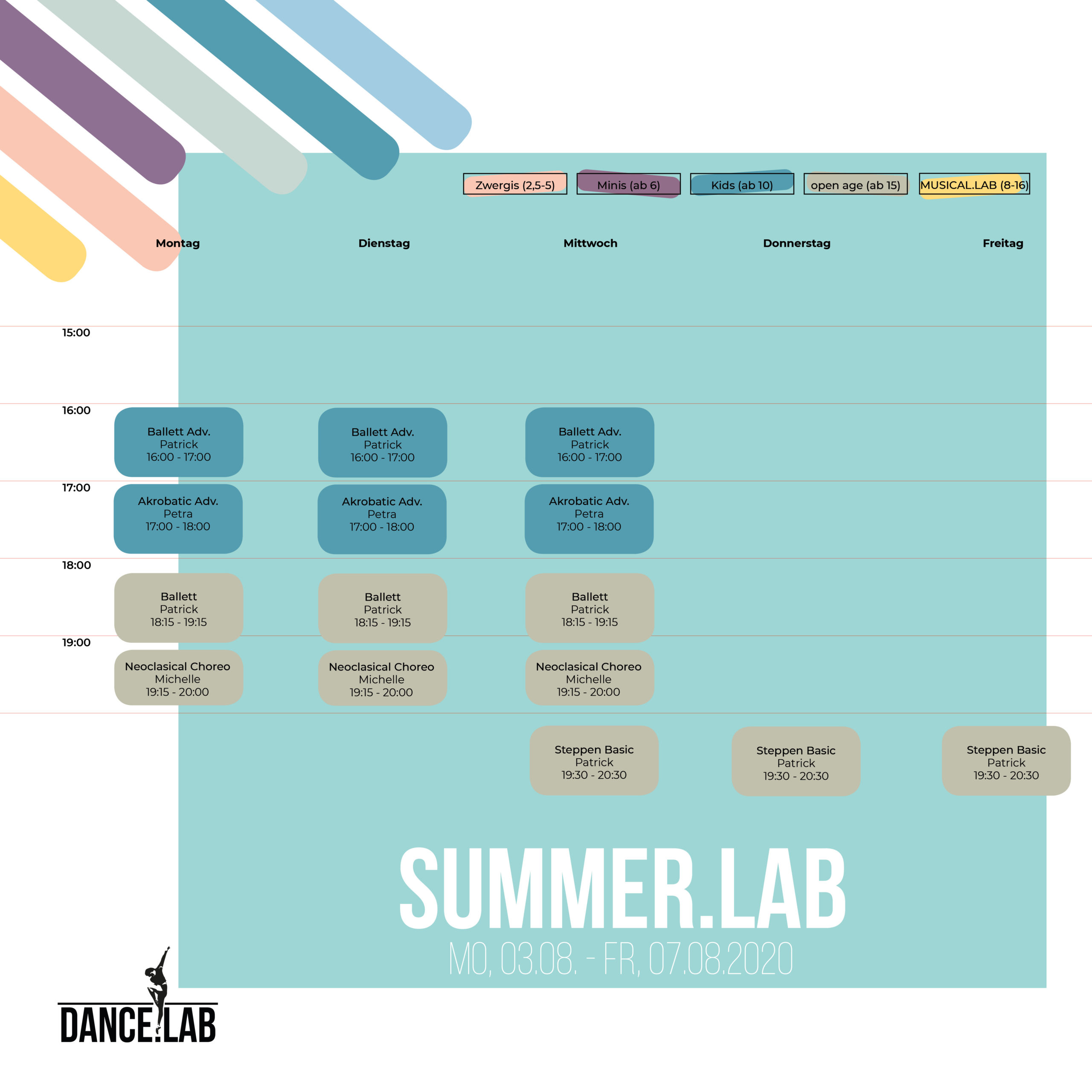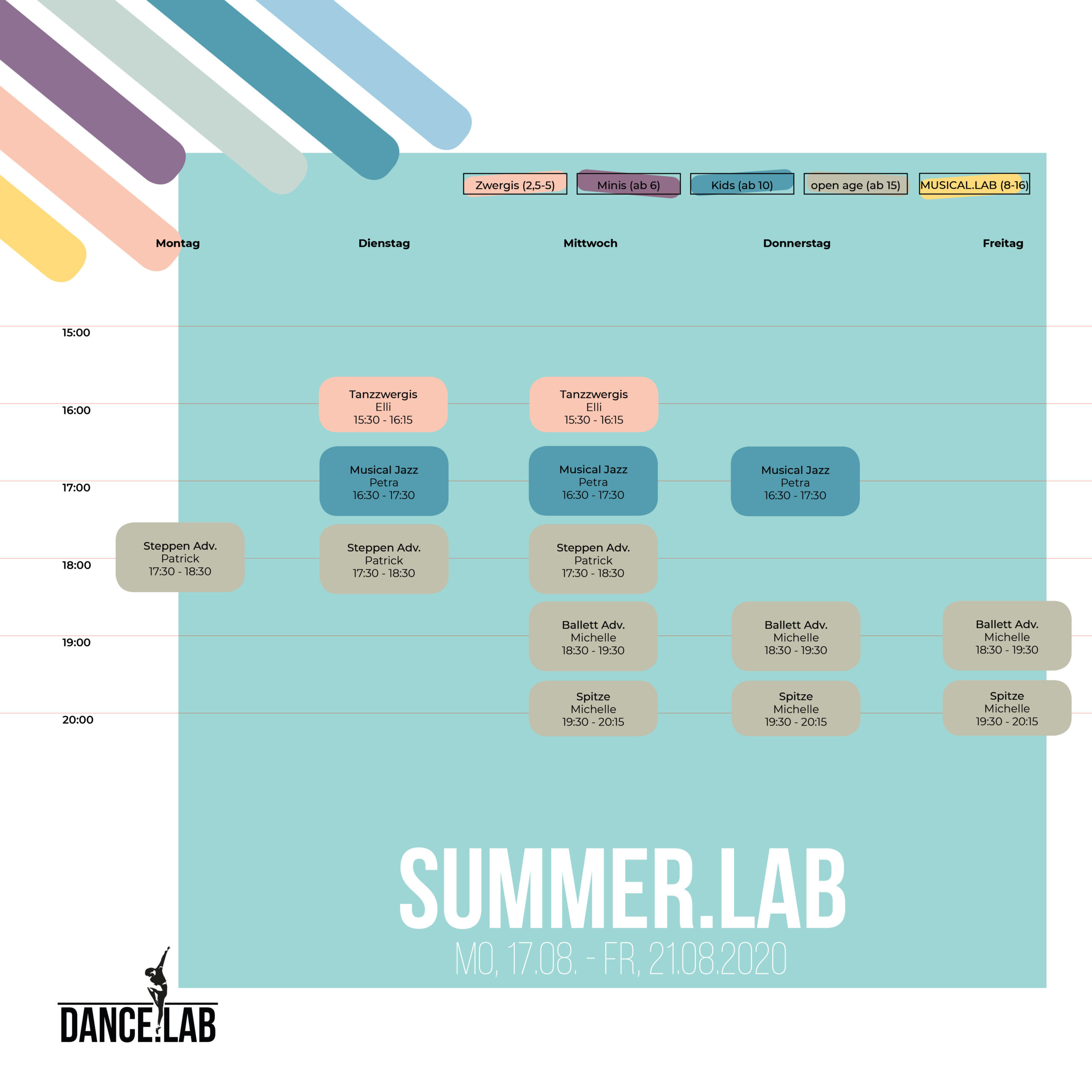 Nach der jetzigen, quasi unfreiwilligen Tanz-Pause freuen wir uns umso mehr darauf, mit dir durch den Sommer zu tanzen. Im Rahmen unseres SUMMER.LABs bieten wir wie auch schon letztes Jahr den ganzen August über tolle mehrtägige Workshops in den unterschiedlichsten Sparten des Tanzes an. Von Kursen für unsere kleinsten Minis bis hin zu Klassen für erwachsene und jung-gebliebene TänzerInnen ist bestimmt für jeden etwas dabei.